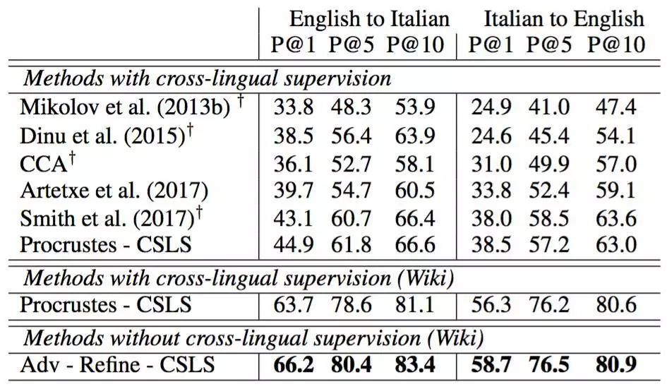 这种方法在一些案例中的结果非常好,比如在英语-意大利语词翻译中,在 P@10 中,该方法在 1500 个源单词上的准确率比最优平均准确率高将近 17%。