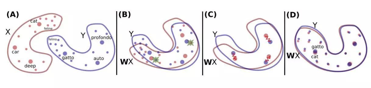 构建两个词嵌入空间之间的映射(图像来源:https://arxiv.org/pdf/1710.04087.pdf)。红色的 X 分布是英语单词的词嵌入,蓝色的 Y 分布是意大利单词的词嵌入。