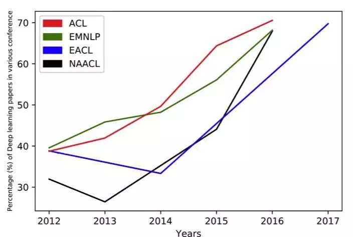 深度学习论文在 NLP 会议论文中的比例(图像来源:https://arxiv.org/abs/1708.02709)。