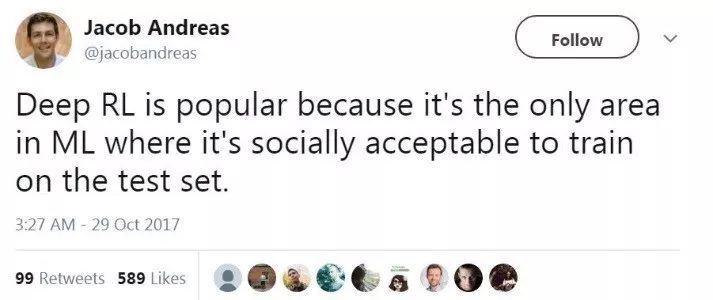 很多著名学者也纷纷加入讨论。目前普遍的观点是,DRL可能有AI领域最大的泡沫。机器学习专家Jacob Andreas发了一条意味深长的tweet说: