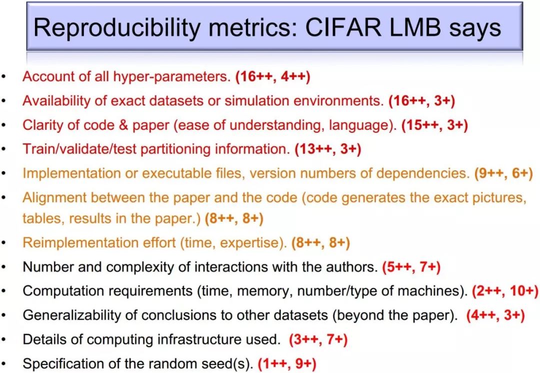 随后,针对DRL领域,Pineau展示了该研究组对当前不同DRL算法的大量可复现性实验。实验结果表明,不同DRL算法在不同任务、不同超参数、不同随机种子下的效果大相径庭。在报告后半段,Pineau呼吁学界关注“可复现性危机”这一问题,并根据她的调研结果,提出了12条检验算法“可复现性”的准则,宣布计划在ICLR 2018开始举办“可复现实验挑战赛”(“可复现危机”在其他机器学习领域也受到了关注,ICML 2017已经举办了Reproducibility in Machine Learning Workshop,并将在今年继续举办第二届),旨在鼓励研究者做出真正扎实的工作,抑制机器学习领域的泡沫。Pineau&Precup研究组的这一系列研究获得了广泛关注。