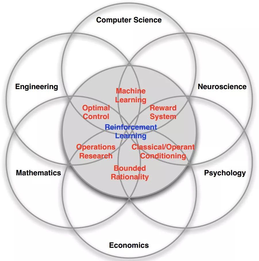 可以说,一切涉及通过选择然后得到反馈,然后从反馈中学习的领域,几乎都有RL的思想以各种形式存在,因此笔者称之为广义的RL。这些学科为RL的发展提供了丰富的研究素材,积累了大量的思想与方法。同时,RL的发展不会仅仅对人工智能领域产生影响,也会推动广义的RL所包含的诸多学科共同前进。