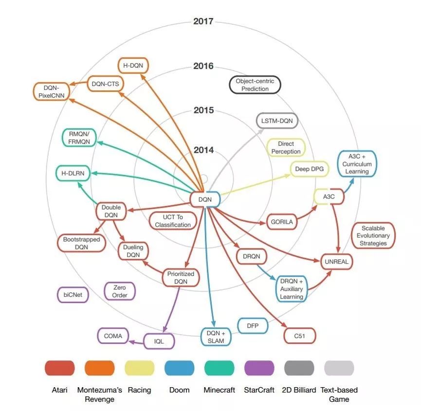 关系RL。近期学习客体间关系从而进行推理与预测的“关系学习”受到了学界的广泛关注。关系学习往往在训练中构建的状态链,而中间状态与最终的反馈是脱节的。RL可以将最终的反馈回传给中间状态,实现有效学习,因而成为实现关系学习的最佳方式。2017年DeepMind提出的VIN[44]和Pridictron[23]均是这方面的代表作。2018年6月,DeepMind又接连发表了多篇关系学习方向的工作如关系归纳偏置[45]、关系RL[46]、关系RNN[47]、图网络[48]和已经在《科学》杂志发表的生成查询网络(Generative Query Network,GQN)[49]。这一系列引人注目的工作将引领关系RL的热潮。