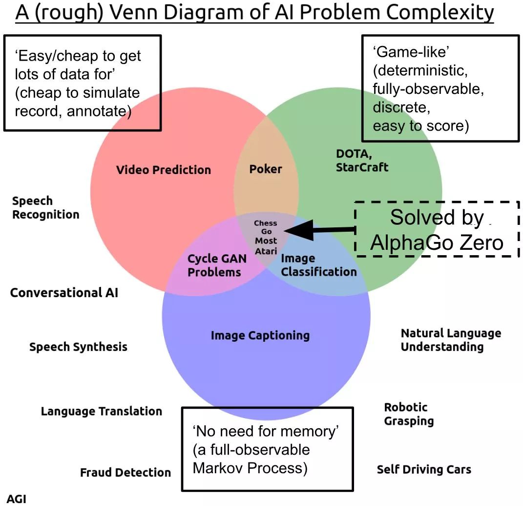 在NIPS 2016上,Yan LeCun认为最有价值的问题是“Predictive Learning”问题,这其实类似于非监督学习问题。他的发言代表了学界近来的主流看法。而Ben Recht则认为,RL比监督学习(Supervised Learning, SL)和非监督学习(Unsupervised Learning, UL)更有价值。他把这三类学习方式分别与商业分析中的描述分析(UL)、预测分析(SL)和指导分析(RL)相对应[18]。