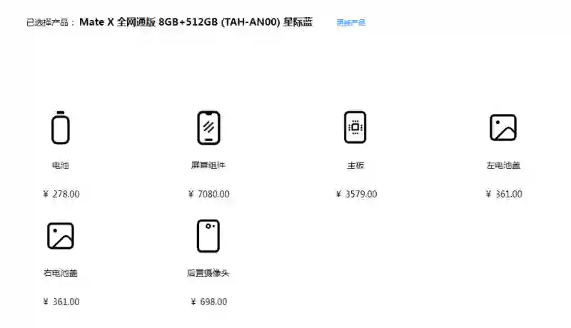 据华为商城显示,华为折叠屏手机Mate X屏幕组件维修价格为7080元,主板维修价格为3579元,左右电池盖维修价格均为361元,后置摄像头维修价格为698元,电池维修价格为278元。