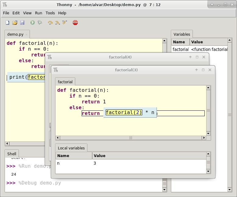 将以下递归程序复制到 Thonny 并以调试模式(Ctrl+F5 或 Ctrl+Shift+F5)运行。