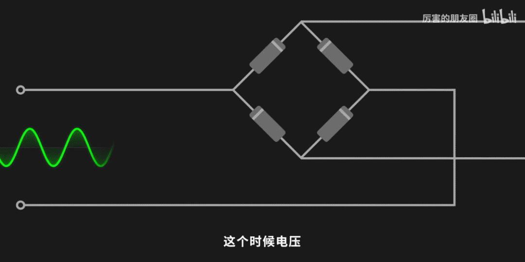 我们手机的电池不能储存这样波动的交流电,刚好就需要 4 根二极管,这种只能单向导电的工作特性,就能把下弦翻转成上弦。这个时候电压就变成了前浪和后浪彼此起伏的水流了。