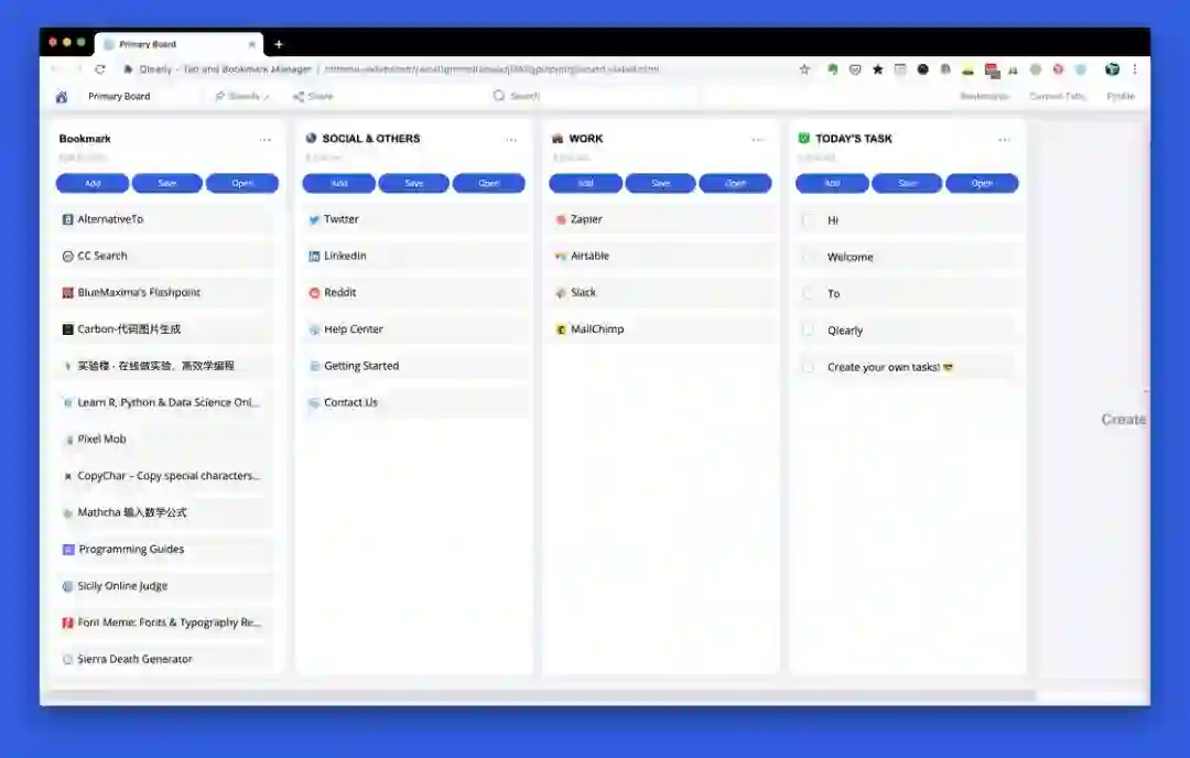 Qlearly 是一款有些特殊的 Chrome 新标签页扩展,你可以用它一键保存当前打开的标签页,将自己的收藏夹、喜欢的网站、暂存备用的标签页等分组收纳,并在需要时快速开启。此外,你还可以与他人协作,并分享自己的标签页组,提高自己的工作效率。