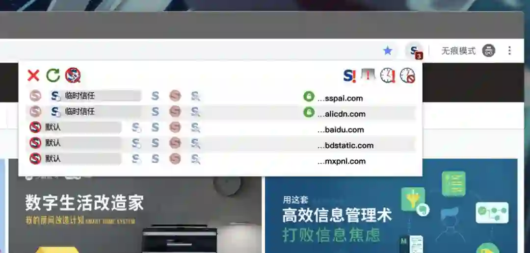 NoScript 是 Firefox 上知名的隐私保护扩展,近期移植到了 Chrome 上,作用是禁止加载 JavaScript、Flash、Silverlight 等可能收集你个人信息的脚本,让你的浏览更加安全。不过,由于 JavaScript 已然成为了网页标配,禁用后会导致大多数网站无法正常访问,需要一段时间的白名单调教后才能正常使用。