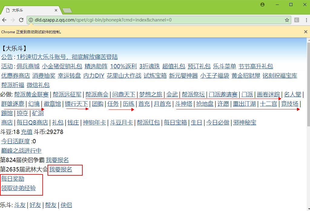 第一步:分析链接,因为直接使用网页动画版(也就是上图)的网址的话,会有Flash动画,可能会因为网络的问题,导致延迟,从而影响程序的运行。所以选择直接关注微信公众号“Q宠大乐斗”,从开始游戏的接口进去,这样就可以进入文字版的游戏,减少不必要的网速占用。
