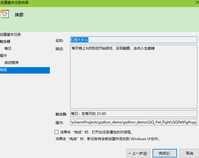 具体的计划任务教程,参考:Python与win的完美结合--计划任务。设置好时间,因为这个游戏的宠物是靠体力来进行的并且每天只能进行一次任务,所以每天定时打一次就可以了。