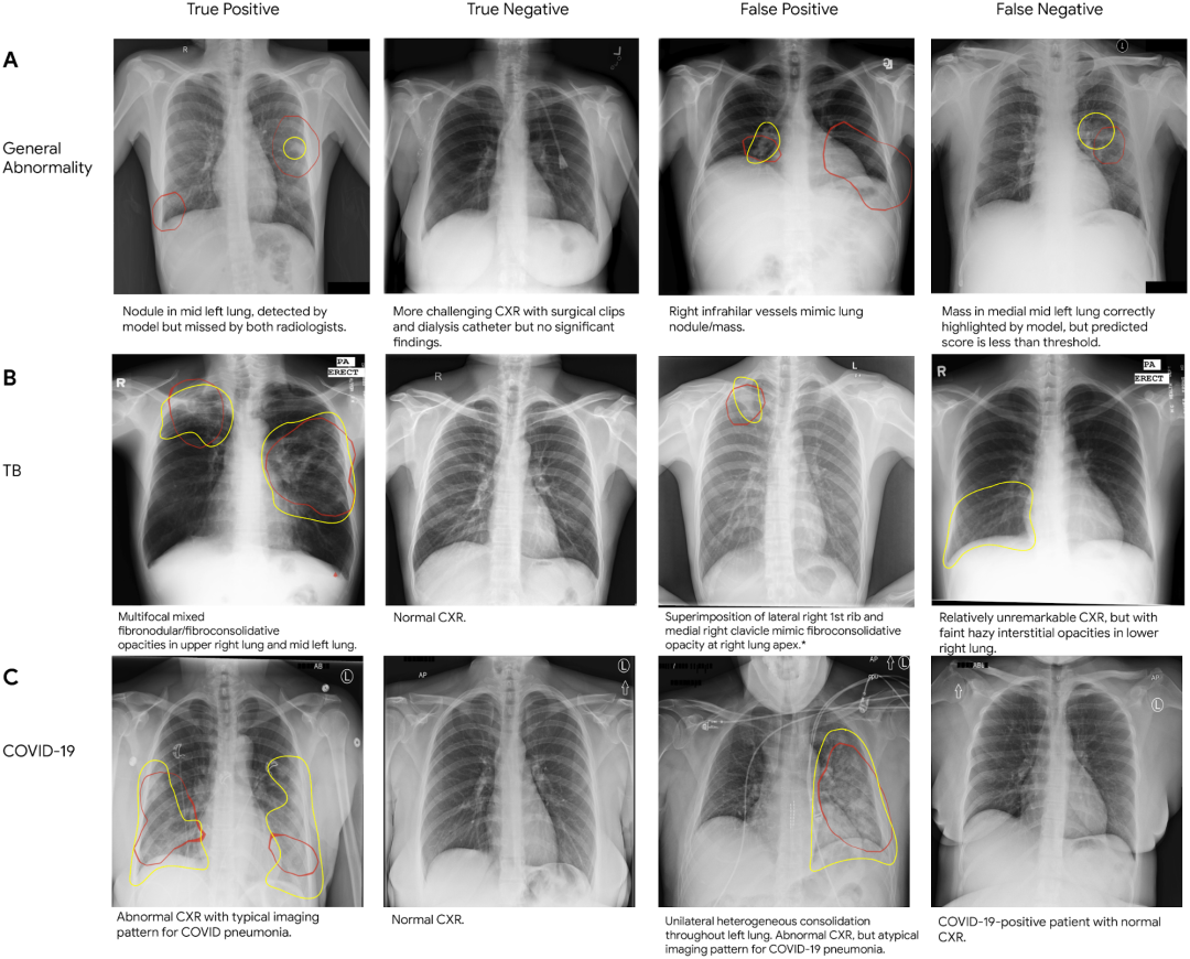 胸部 X 光片的真假阳性及真假阴性样本,(A) 代表一般异常情况,(B) 代表结核病,(C) 代表新冠肺炎。在每张 CXR 上,我们用红色勾勒出模型重点识别为异常的区域(即类激活图),并用黄色勾勒出放射科医生指出的兴趣区域