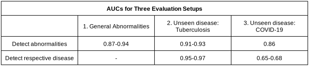 此外需要注意的是,泛化到未知疾病(即结核病和新冠肺炎)和泛化到未知 CXR 结果(例如胸腔积液 、实变 /浸润)之间存在差别。在此项研究中,我们证明了该系统在检测未知疾病方面的通用性,但对于未知 CXR 结果则不具有通用性。