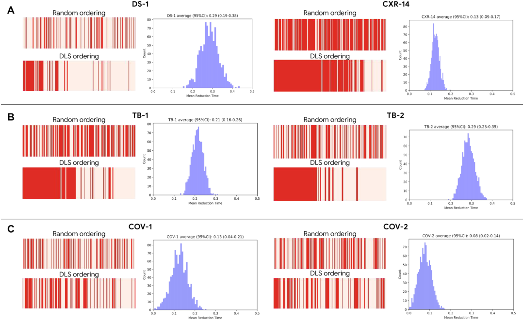 模拟基于深度学习模型优先级排序所带来的影响(与随机审查顺序对比):(A) 代表一般异常情况,(B) 代表结核病,(C) 代表新冠肺炎。红条中异常 CXR 序列为红色,正常 CXR 序列为粉色;左侧的红条密度较大,表示异常 CXR 会在正常 CXR 之前被审查。直方图表示平均周转时间得到改善