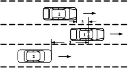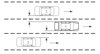试验车辆以(50+2) km/h 匀速直线行驶,目标车辆在相邻车道匀速直线行驶并保持与试验车辆的横 向距离为(L5±0.3) m,目标车辆以高于试验车辆的速度匀速行驶并超越试验车辆,见图 8。目标车辆跟据表 1 规定场景的车速行驶于试验车辆侧后方,当两车达到试验开始两车纵向距离时,试验开始;当目标车辆的前缘超越试验车辆图 4、图 5 所示 C 线 3m 时,试验结束。