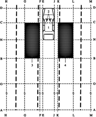 如果目标车辆任何部位均未处于 A、D、J 和 M 四条直线交叉覆盖区域内,则不应发出右侧盲区警告。