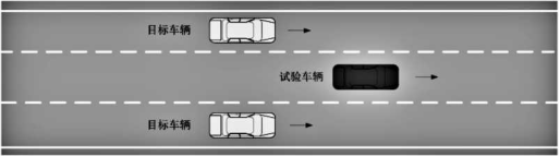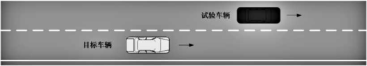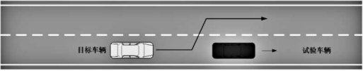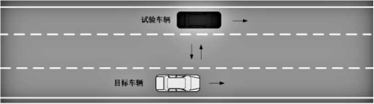试验车辆以(50+2) km/h 匀速直线行驶,目标车辆以(60±2)km/h 同车道驶向测试车辆,见图 9。开始测试时,目标车辆与试验车辆相距大于 20m,当目标车辆距试验车辆图 4、图 5 所示 B 线 10m 时,目标车辆以 0.55m/s~0. 85m/s 的侧向速度从试验车辆侧后方进行变道至两车的横向距离在(1.5+0.3)m。变道完成后,目标车辆保持直线行驶,直至目标车辆完全超越试验车辆的前缘,当目标车辆的前缘超越试验车辆图 4、图 5 所示 C 线 3m 时,试验结束。测试完成后应由试验车辆另一侧重复进行该试验。