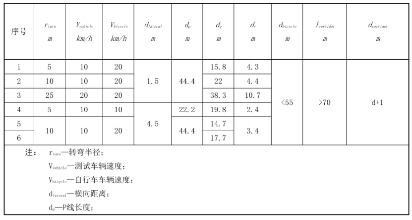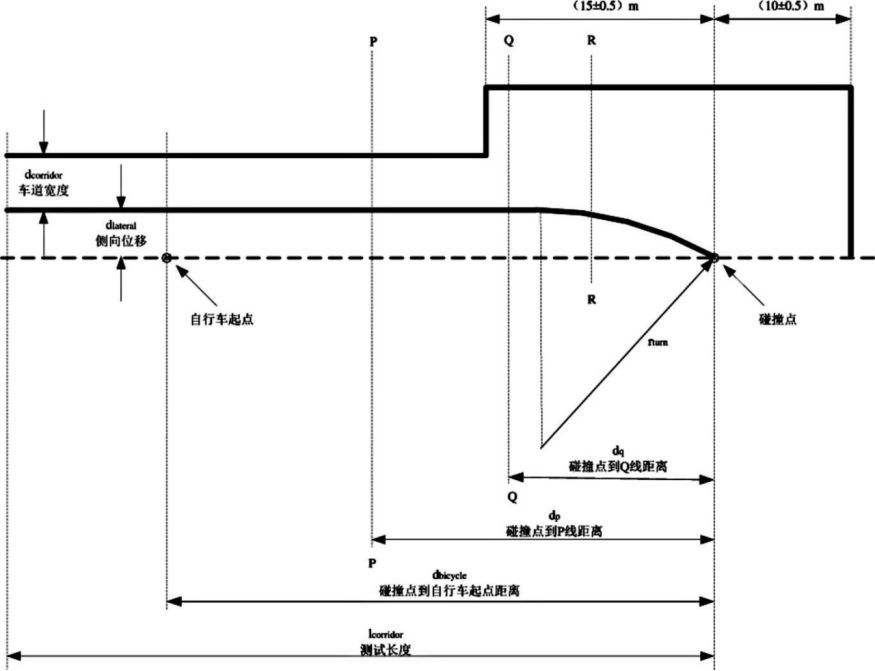 将试验车辆和自行车假人从各自的起始位置按照规定的试验车速进行测试,试验要求试验车辆前缘 在通过图 11 中 Q 线(误差在 0.5m 以内)的同时自行车假人通过图 11 中 P 线(误差在 0.5m 以内), 试验车辆在规定车速(土2km/h 的范围内)向右转向,朝设定的碰撞点行驶。自行车假人以规定的速度, 至少保证自行车假人车速稳定 8s 以上,沿着规定的路线向预定的碰撞点移动。