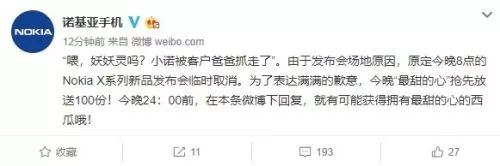 据消息了解,诺基亚手机发布官微称:“由于发布会场地原因,原定今晚8点的Nokia X系列新品发布会临时取消。“只解释了7月11日晚上8点的Nokia X系列新品发布会是因为场地原因造成的取消,并没有给出明确的其他的发布会时间。