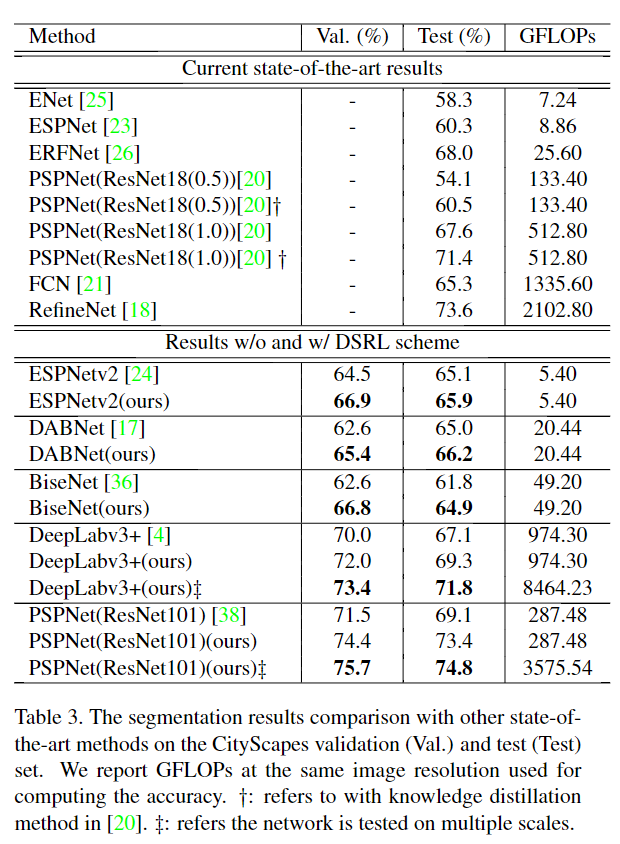 在分别代表轻量级网络和大型网络的ESPNetv2和DeepLabv3 +上进行了实验,并在Cityscape验证集上评估了mIoU。将图像的尺寸调整为256×512,作为加速实验训练的输入。如表1所示,以ESPNetv2为例,可以看到SSSR可以将性能从54.5%提高到55.7%,因为它减少了ground truth的定标时间。通过添加SISR分支,可以将mIoU有效提高2.4%。在结合FA损失的同时,性能可以进一步提高到59.5%(比baseline高5.0%),因此表明在SISR和SSSR之间传输结构信息是必要的。DeepLabv3 +上的结果也可以得出相同的结论,这始终证明了所提出的DSRL的有效性。
