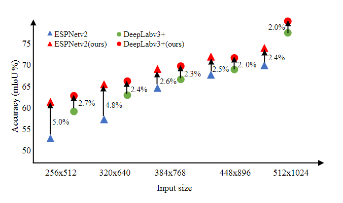 图1 CityScapes验证集上不同网络的准确性与输入大小的关系。绿点表示具有不同输入大小的DeepLab-v3 +的结果:256×512、320×640、384×768、448×896、512×1024和1024×2048,蓝色三角形标记ESPNetv2的结果。红色表示分别基于DeepLabv3 +和ESPNetv2的方法的结果。