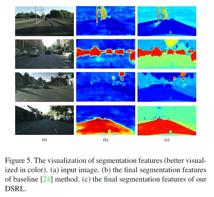为了更好地理解DSRL,还可视化了baselineESPNetv2和DSRL之间的最终分割特征。如图5(c)所示,本文的方法可以显着提高边界的清晰度,并改善道路,汽车等不同类别的完整性,从而无疑增强了模型的最终判别能力。