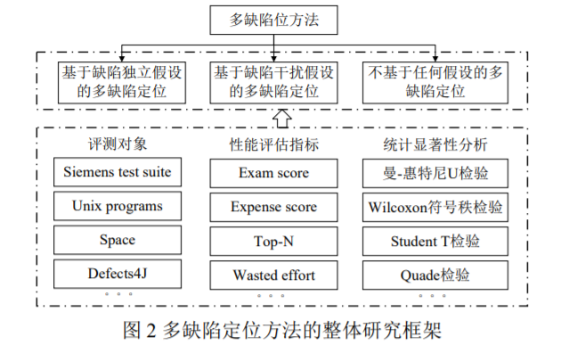 软件多缺陷定位(MultipleFaultLocalization,简称 MFL)尝试在含有多个缺陷的软件程序中自动标识出这些缺陷所在 的位置。传统的缺陷定位研究一般假设被测软件内仅含有一个缺陷,而实际情况下软件内往往包含多个缺陷,因此 MFL 问 题更加贴近实际场景。当程序中存在多个缺陷时,由于缺陷数量难以准确估计,同时缺陷之间可能存在互相干扰,因此对 MFL 问题的研究更具挑战性。已有研究表明传统单缺陷假设下的缺陷定位技术会随着程序中缺陷数目的增多而出现定位效 果下降的问题。因此,需要对已有缺陷定位技术加以改进使其在 MFL 问题中具有更好的缺陷定位效果。本文以 MFL 研究 问题为核心,对相关研究成果进行了系统的梳理。首先将已有的 MFL 技术细分为三类,分别是基于缺陷干扰假设的多缺陷 定位方法,基于缺陷独立假设的多缺陷定位方法和不基于任何假设的多缺陷定位方法;然后依次总结了每一类方法的主要设 计思想和相关研究成果,随后分析了 MFL 研究中经常使用的评测指标和评测对象;最后,本文从扩大评测对象的编程语言 范围、考虑更多的软件程序、寻找更多的工业应用场景等多个角度对 MFL 的未来研究方向进行了展望。