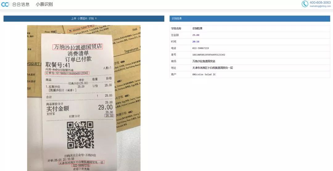 合合信息实施了端到端的收据识别解决方案,允许收据图片上传,识别和结果呈现。 其识别能力由深度学习算法提供支持,具体包括用于特征提取和定位文本的CNN,用于项目映射的NLP等。此外,他们还可根据客户的培训数据对其模型进行再培训。作为合合信息的图像识别服务,NLP服务和逻辑服务是分开的,他们很容易在Azure上部署其解决方案。