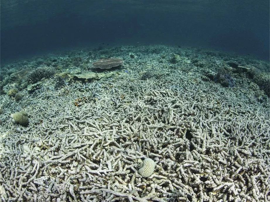 这张照片里的珊瑚礁一片死寂,鱼啊、虾蟹啊都已经看不到了,很惨,但这就是现在珊瑚礁的现实。