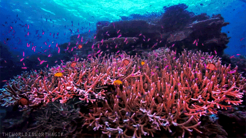这张照片里的珊瑚礁欣欣向荣、色彩斑斓,周围聚集了大量的鱼虾贝藻和其他生物。它被誉为海底热带雨林,它的生物多样性之高也令人惊叹。