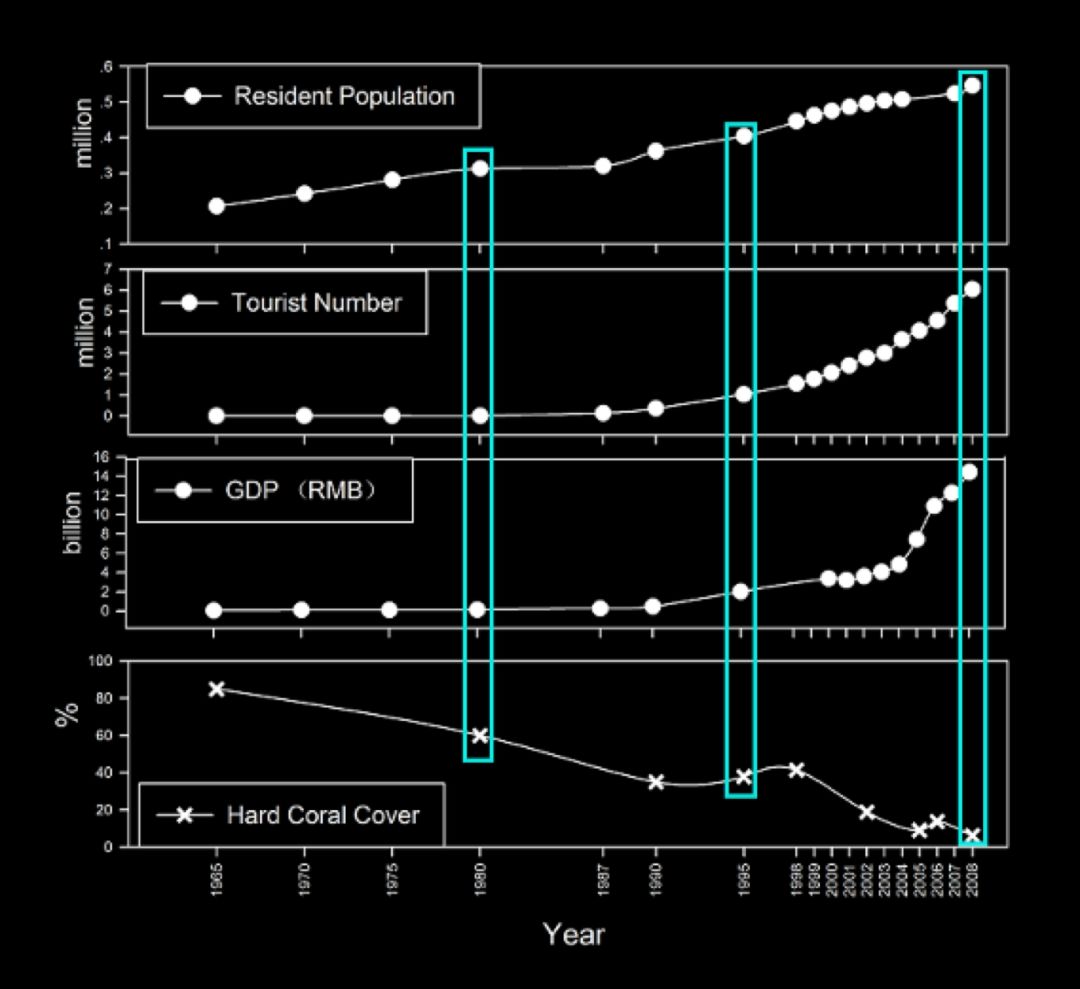 上图是对三亚常驻人口、旅游人口数量、GDP、珊瑚覆盖率变化的一个统计,可以发现,随着旅游人流量、GDP的快速增长,珊瑚覆盖率呈现快速的下降趋势。