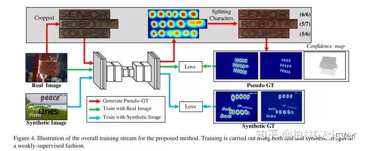 训练在一个弱监督学习的方式下,有人造合成的数据集具有字符级别的label,real image没有字符级别的标注时,自己检测合成产生label再进行训练。如上图所示,对真实场景中的数据集和人造合成的数据集有不同的训练方式。