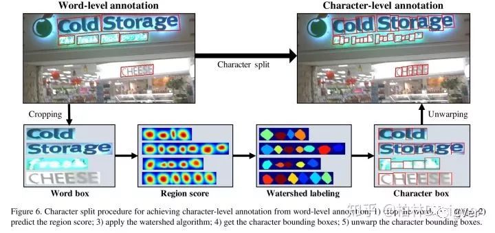 改论文主要预测每个字符区域和字符之间的一个紧密程度预测,因为没有字符级别的label,所以模型训练在一个弱监督的方式下。网络的backbone采用VGG16,之后接上采样最终输出两个通道:the region score and the affinity score
