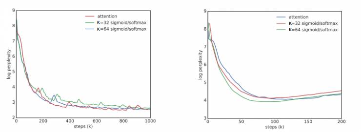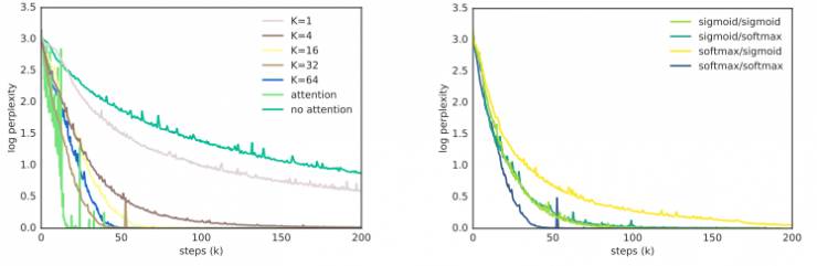 下图左侧展示了序列长度为200的学习曲线。可以看到K=1不能拟合数据分布,而K∈{32,64}几乎与基于attention的模型一样快。越大的K能够导致更快的收敛速度,较小的K的性能与non-attention基线相似。右图展示了在softmax和sigmoid之间改变编码器和解码器评分函数的效果。所有组合都可以拟合数据,但有些收敛速度比其他更快。