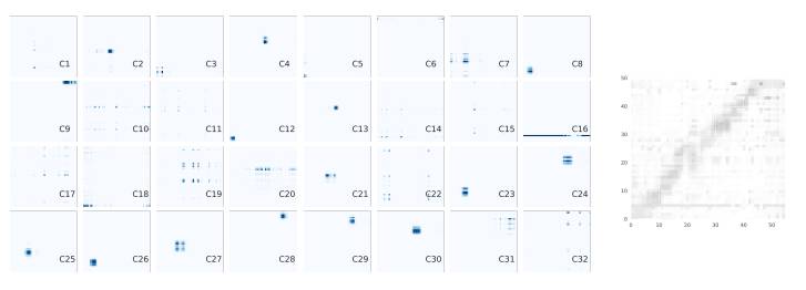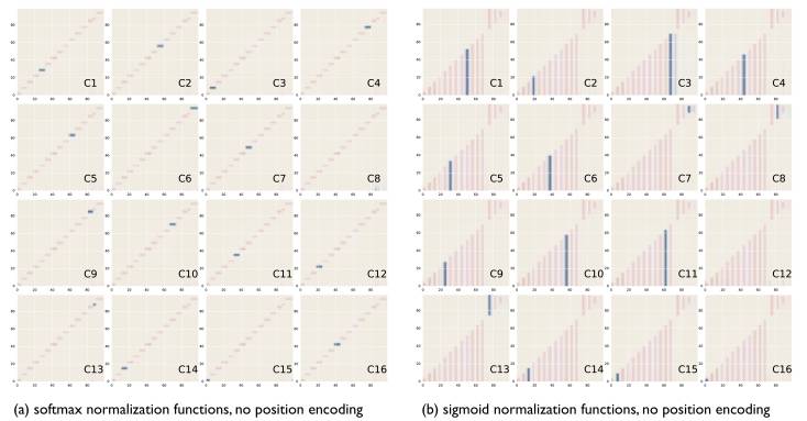 上图为在使用sigmoid评分函数和K=32的模型下,对每个步骤进行解码的en-de WMT翻译任务的attention分数。左侧子图分别显示每个单独的attention向量,右侧子图显示attention的完整组合。