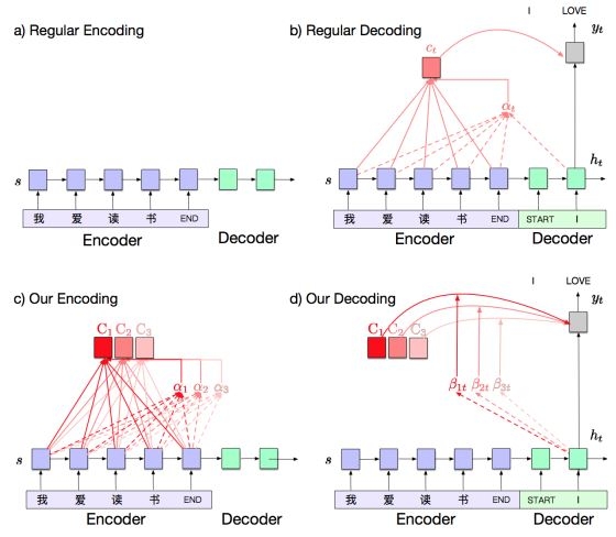上图为该方法与标准注意力模型的结构对比。在编码阶段预测K个attention向量,在解码阶段线性组合这些预测。在上图中K=3。可以将基于记忆的注意力模型解释为“预测”编码期间由标准attention机制产生的一组注意上下文。如上图,K=3,在这种情况下,在编码阶段预测所有3种attention上下文,并在解码过程中学习选择合适的attention上下文,进行线性组合。这中方法比基于解码器编码内同的诸葛计算上下文更加节省计算量。