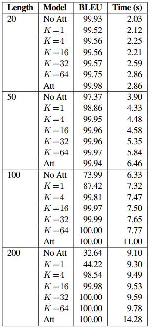 下表展示了该模型在不同序列长度和K的情况下的BLEU分数。较大的K可以计算复杂的源表示,值为1的K限制了源表示为单个向量。可以看到,性能一直随着K的增加而增加,这取决于数据长度,更长的序列需要更复杂的表示。无论是否具有位置编码,结果在玩具数据集上几乎相同。尽管表示能力较低,但该方法仍与标准attention机制模型一样能够拟合数据。两者都以显著的差距击败non-attention基线。最后一列表明了该方法能够极大的加速推理过程,随着序列长度变长,推理速度的差距越来越大。