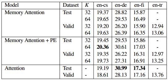接下来,研究者测试了基于记忆的attention方法能否拟合复杂的真实数据集。研究人员使用了WMT’15的4个大型机器翻译数据集:English-Czech, EnglishGerman, English-Finish, 和English-Turkish。
