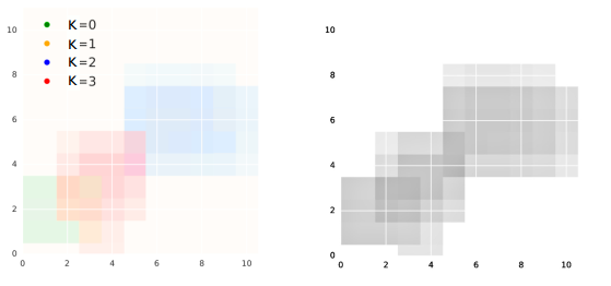 上图为在序列长度为11的样本上的K=4的解码的每个步骤的attention分数,(y轴:源; x轴:目标)