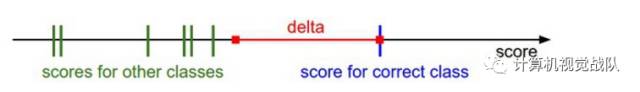 多类SVM“想要”正确类别的分类分数比其他不正确分类类别的分数要高,而且至少高出delta的边界值。如果其他分类分数进入了红色的区域,甚至更高,那么就开始计算损失。如果没有这些情况,损失值为0。我们的目标是找到一些权重,它们既能够让训练集中的数据样例满足这些限制,也能让总的损失值尽可能地低。