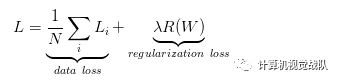 上面的表达式中,将W中所有元素平方后求和。注意正则化函数不是数据的函数,仅基于权重。包含正则化惩罚后,就能够给出完整的多类SVM损失函数了,它由两个部分组成:数据损失(data loss),即所有样例的的平均损失,以及正则化损失(regularization loss)。完整公式如下所示: