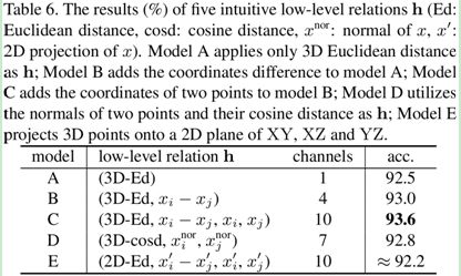 公式(3)中的几何先验 可以进行灵活地定义,我们在 ModelNet40 上测试了五个比较直观的例子,结果如表 6 所示。可以看到,仅仅使用 3D 欧式距离作为低维几何关系(model A),RS-CNN 依然能够取得 92.5% 的精度,这很让人印象深刻。此外,为了测试 RS-CNN 的几何形状推理能力,我们强制置零某一维的坐标值,即将 3D 点云投影到 2D 空间(model E,图 9),得到的分类精度均接近 92.2。这证明了 RS-CNN 不仅可以从 3D 点云中学习 3D 形状,还能从 2D 投影空间中推理 3D 形状。