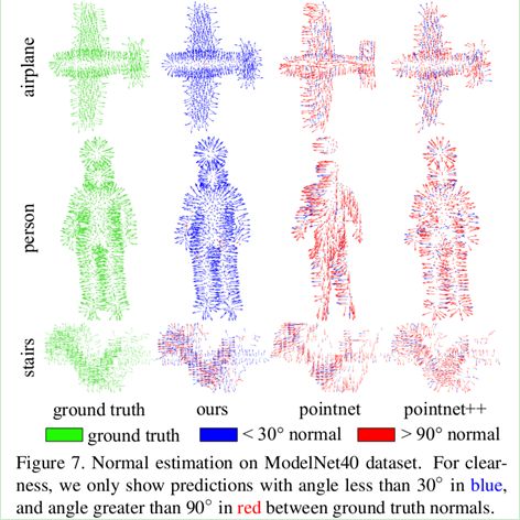 ModelNet40 上的法向预测结果如图 7 所示。与 PointNet 以及 PointNet++相比,RS-CNN 可以取得更加准确的法向预测结果。尽管如此,RS-CNN 仍然难以有效推理棘手的形状,比如旋转楼梯以及错综复杂的植物。