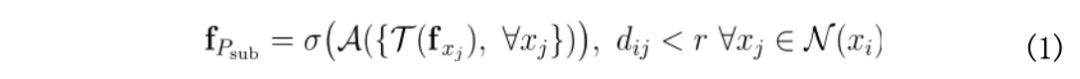 其中 x 是三维点,f 是特征向量,dij 是点 xi 和 xj 的 3D 欧式距离,r 是球半径。卷积结果 f Psub 通过首先使用函数 τ 对邻域中每一个点进行特征变换,然后使用函数 A 聚集变换后的特征,最后经过非线性 σ 激活后获得。注意到仅当 A 是对称函数,并且函数 τ 对邻域中每一个点均共享参数时,f Psub 对输入点的顺序具有置换不变性。