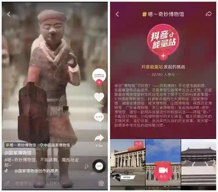 成效如何呢?抖音里有个「嗯~奇妙博物馆」挑战,排名在前的都是几个博物馆的官方账号,很皮很会玩,应该可以吸引一些人去博物馆。不过效果也有限,挑战只有三万多人参加,普通用户很少,在抖音这样一个用户基础的地方来宣传博物馆活动,还是有那么一点违和,不如说刷屏的 H5 影响力要更大。