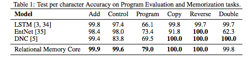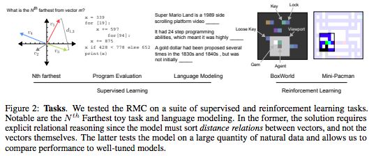 总的来说,我们的结果显示,记忆交互的显式建模还提高强化学习任务,以及程序评估、比较推理和语言建模的性能,这表明在递归神经网络中加入关系推理能力的价值。