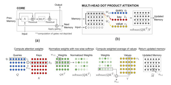 我们的指导设计原则是提供一个架构的主干,在这个基础上,模型可以学习如何划分信息,以及如何计算划分的信息之间的交互。为了实现这一点,我们从LSTM、 memory-augmented神经网络和non-local网络(特别是Transformer seq2seq模型)组装构建块。与记忆增强架构相似,我们考虑一组固定的memory slots;但是,我们允许使用注意里机制在memory slots之间进行交互。与之前的工作相反,我们在单个时间步上在记忆之间应用注意力,而不是跨过在先前的观察中计算出来的所有先前的表征。