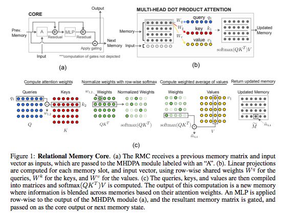 在这篇论文中,DeepMind和伦敦大学学院的研究人员首先证实一种直觉想法,即标准的记忆架构在一些涉及关系推理的任务上很困难。然后,研究者通过使用一个新的记忆模块——Relational Memory Core(RMC)——来改进这种缺陷,该模块采用multi-head dot product attention来允许记忆交互。