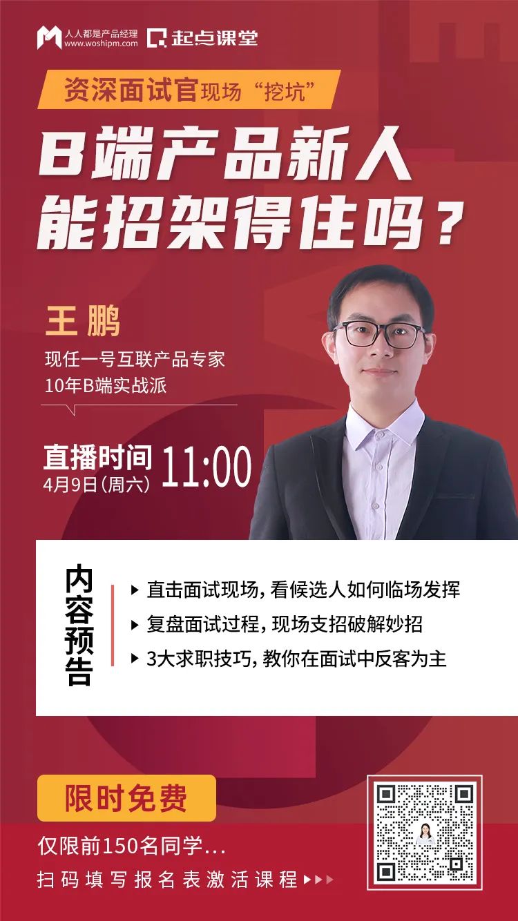 我们邀请了互联一号产品专家@王鹏老师担任面试官,并从起点课堂的粉丝中征集了一位正在求职的同学作为面试者,双方将在4月9日(周六上午11点)进行【在线连麦模拟面试】。
