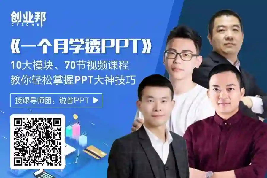 现在就可以加入他们,创业邦正式上线了锐普精英团队推出的《1个月让你学透PPT》——教你从0基础到玩转PPT !